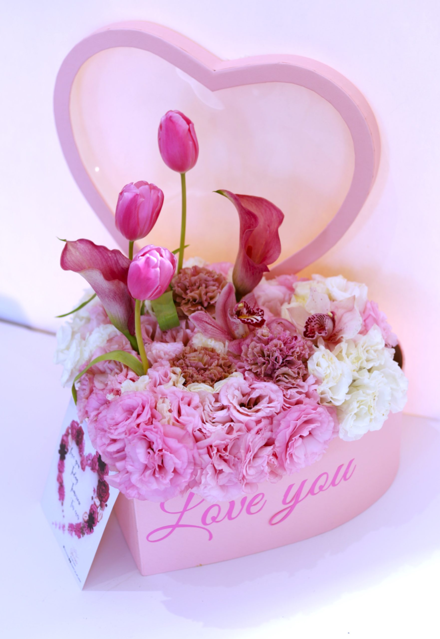 קופסת לב ורודה אלגנטית במיוחד עם פרחים משולבים ורודים