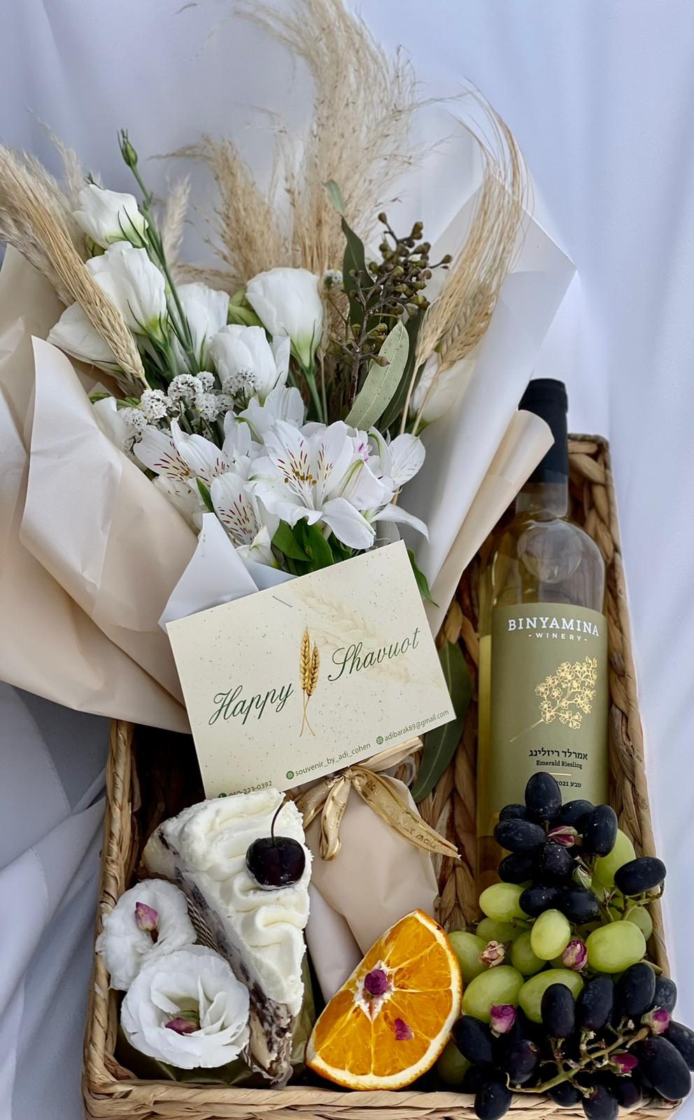 מתנה לשבועות עוגת גבינה יין לבן פרחים לבנים מעוצבים ופירות העונהמארז שבועות חגיגי מושלם
